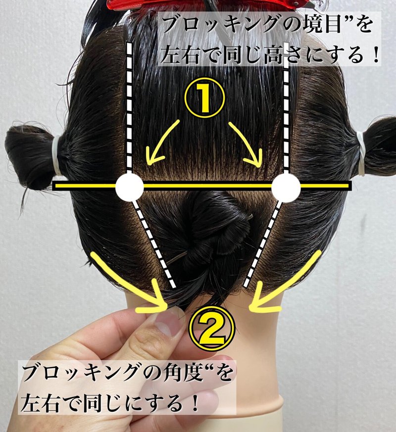ブロッキング ワインディングの仕上がりの完成度は、ブロッキングによって決まるといっても大げさではありません。 ただし 必ずしもブロッキングをしなくてはいけないわけではありません。 しかし「ブロッキングをキレイに取ることが体に染みついている」ことが大切になります。 学校によってはその切り方をしないと怒られる、、というケースも。 切り方がわからないで困っている方。 学校の切り方に合わせてご紹介させて頂いております。 ブロッキングなしでスタート フロントから先にノーブロッキングでカット こちら バックをブロッキング~ バックにウィッグを回します。 ブロッキングは正確に、、 こちらブロッキング(9ブロック・5分)時間内に全頭を巻く・正しいスライス・角度・(オンベー ス・1/2オフベース)・フロントのスライスを正しく ブロッキング(9ブロック・5分)全頭を巻く・正しいスライス・角度・ フロントのスライス